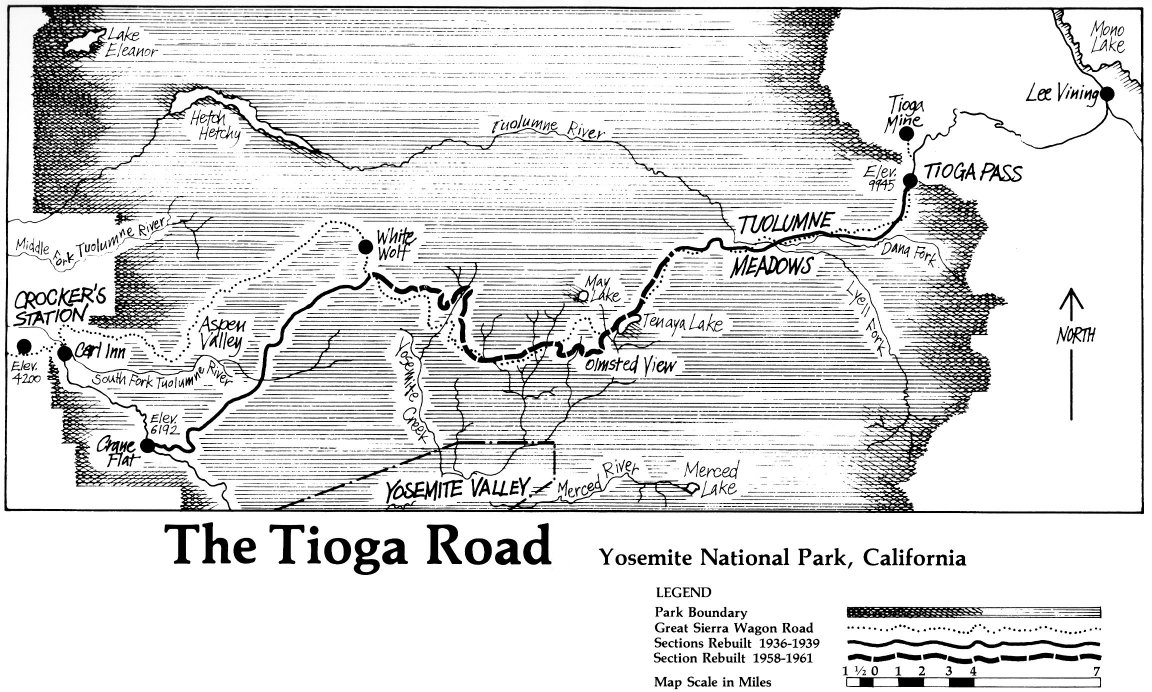 From Mono Lake and the town of Lee Vining, the eastern entrance to Yosemite Nat'l Park is by way of Tioga Pass, CA highway 120, a cliff-hanger and steep climb up 3000' in 12 miles to the summit just shy of 10,000' at the park's entrance. I would not recommend this route in larger RVs, especially if you like to pull over, as we do frequently, for photos and short hikes.
